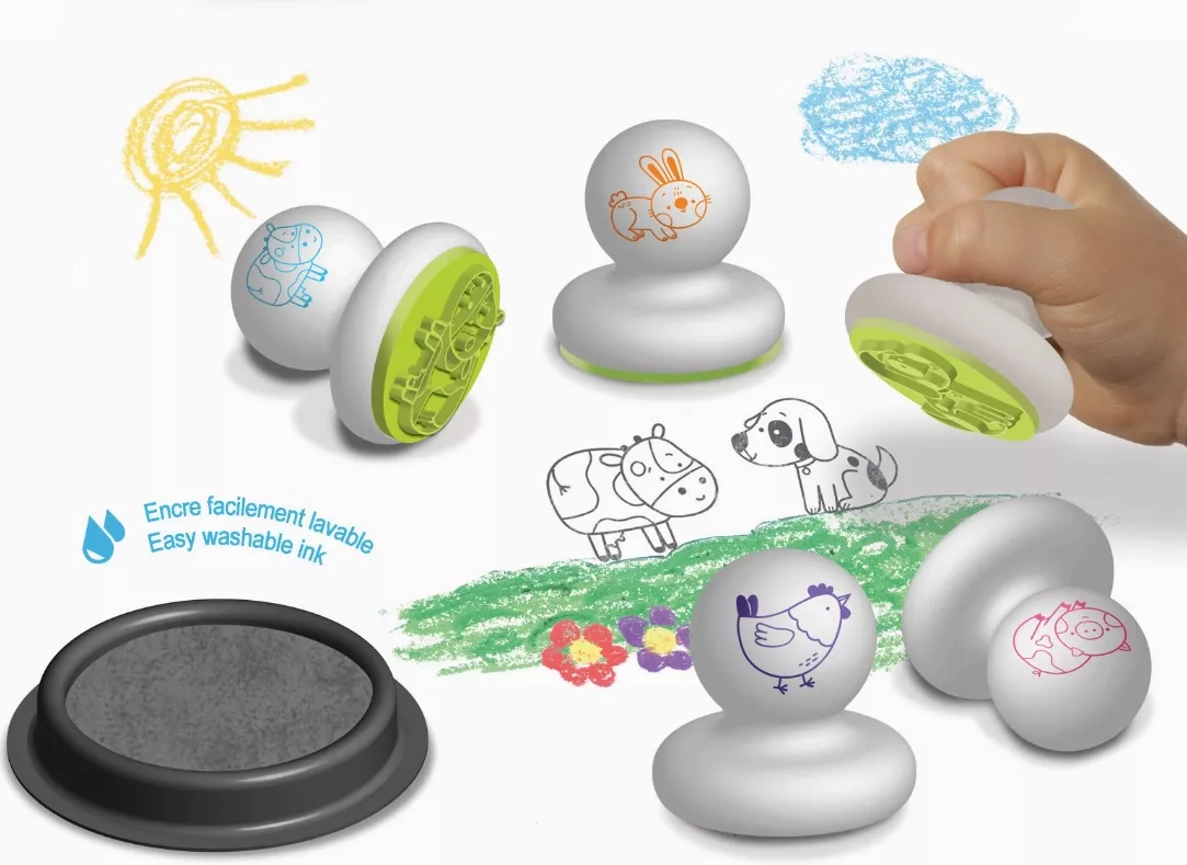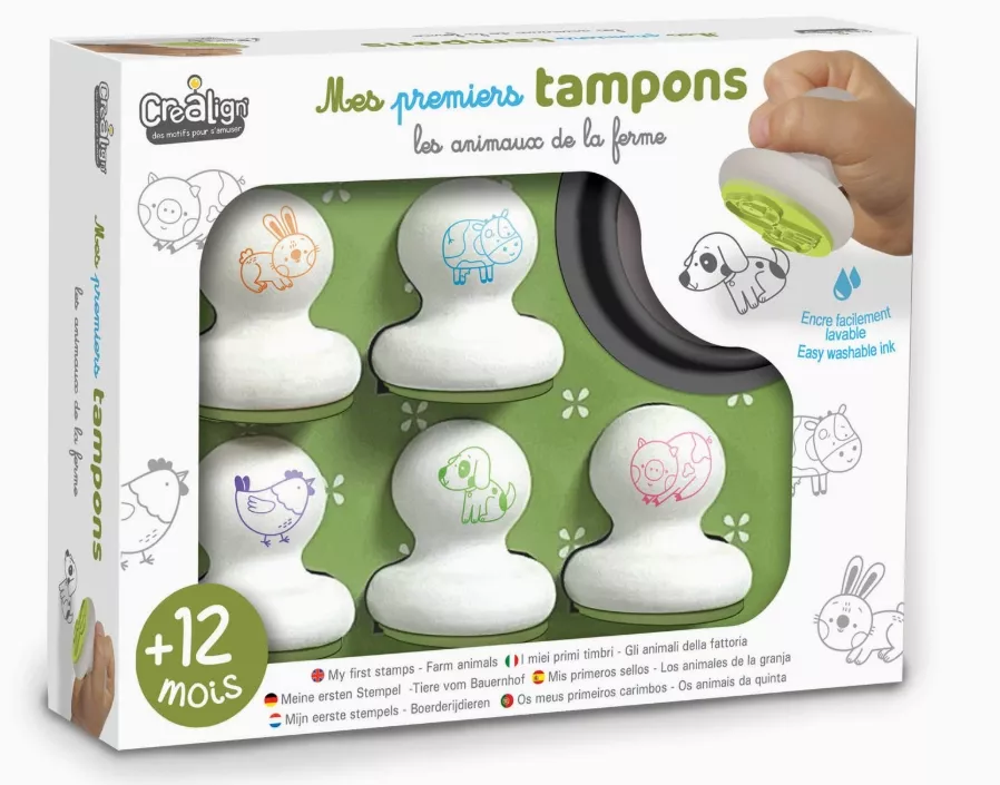 Un pack sur le thème de la ferme contenant 5 tampons en mousse et un encreur maxi format. La poignée ronde facilitera la prise en main. Ce coffret permettra aux tout-petits de découvrir le plaisir du tampon tout en les aidant à développer leur motricité fine. Contient 5 tampons en mousse et 1 encreur maxi format gris Ø 5,5 cm. Taille des empreintes environ 4 cm, un lapin, une vache, une poule, un chien et un cochon.
