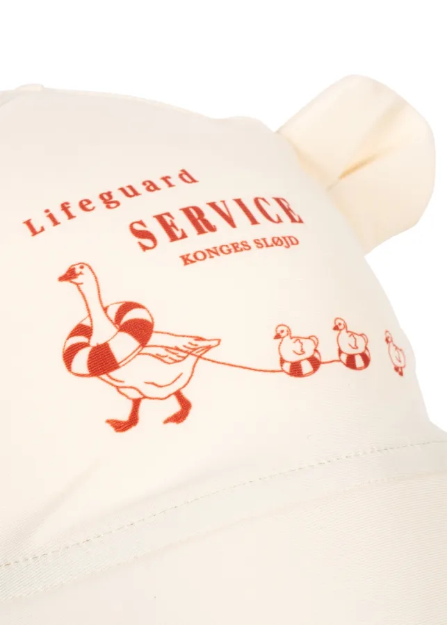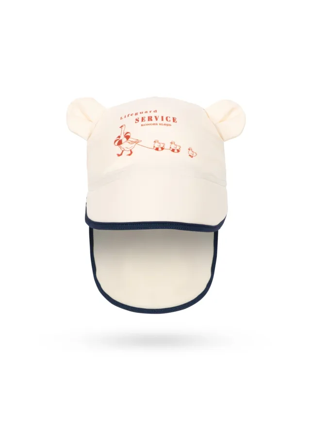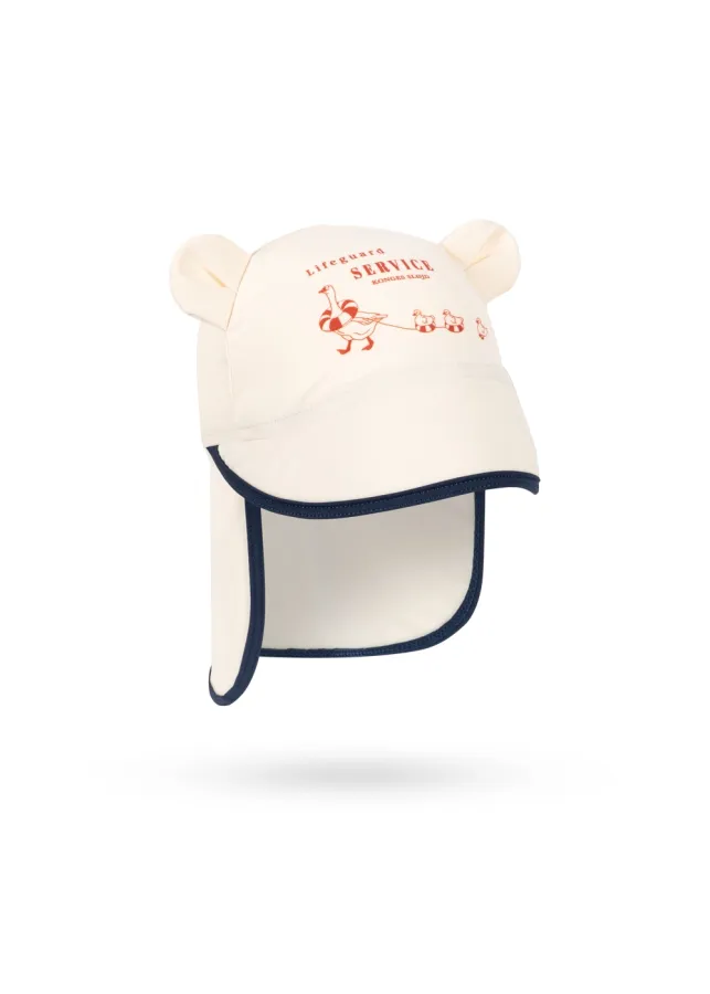 Chapeau de soleil Konges Slojd avec rebord élargi à l'arrière pour protéger le cou des enfants du soleil. Conçu avec de petites oreilles d'ours sur le dessus.