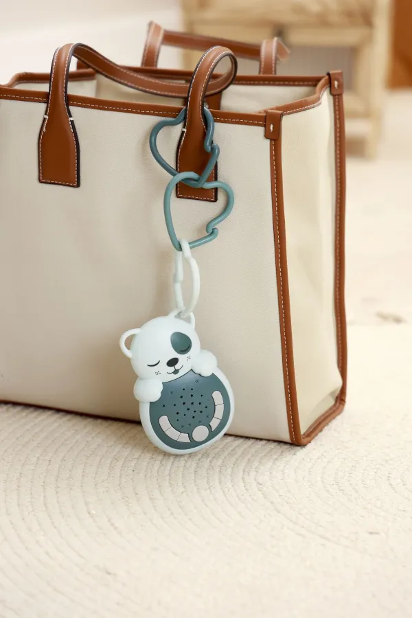 Le visage du petit chien s'illumine d'une couleur ambrée douce et apaisante 4 mélodies apaisantes et 4 bruits blancs : Le rythme cardiaque de la mère / bruits de l’océan Pluie / Mélodie Le La lu Clair de lune / Douce mélodie Berceuses / « Shhh » Smart sensor : relance automatiquement quand bébé pleure pour l’apaiser. Trois modes : Lumière et musique sans smart sensor, lumière et musique avec smart sensor, lumière seule Contrôle du volume réglable Minuterie : Arrêt automatique après 15 minutes pour la lumière. Arrêt automatique après 45 minutes pour le son. Clip en forme de cœur permettant de fixer le petit chien à la poussette et au siège-auto.
