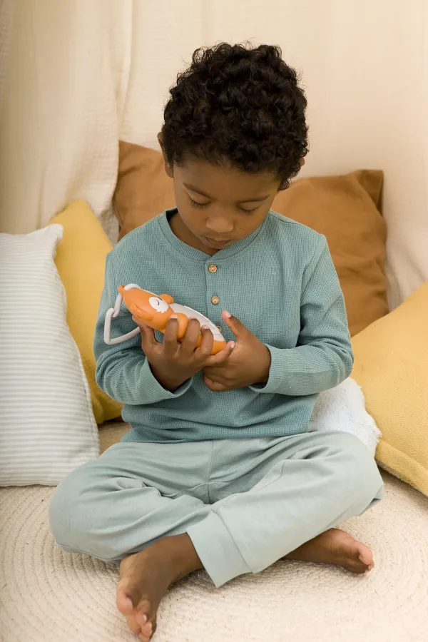 Le visage du petit renard s'illumine d'une couleur ambrée douce et apaisante 4 mélodies apaisantes et 4 bruits blancs : Le rythme cardiaque de la mère / bruits de l’océan Pluie / Mélodie Le La lu Clair de lune / Douce mélodie Berceuses / « Shhh » Smart sensor : relance automatiquement quand bébé pleure pour l’apaiser. Trois modes : Lumière et musique sans smart sensor, lumière et musique avec smart sensor, lumière seule Contrôle du volume réglable Minuterie : Arrêt automatique après 15 minutes pour la lumière. Arrêt automatique après 45 minutes pour le son. Clip en forme de cœur permettant de fixer le petit renard à la poussette et au siège-auto.