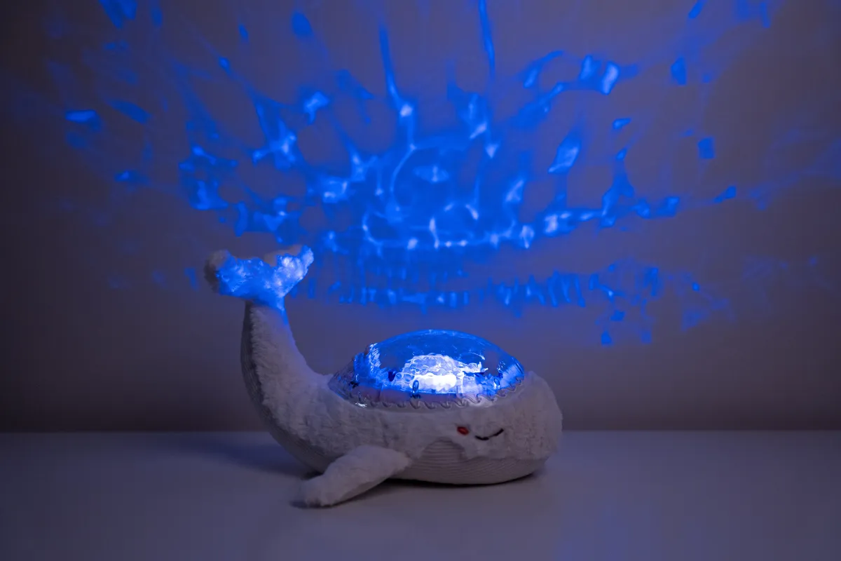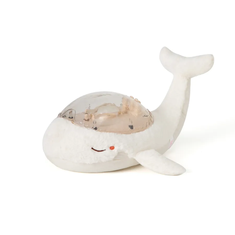 Tranquil Whale™ - Blanc (Rechargeable), jolie baleine musicale fabriquée en fibres 100 % recyclées, issues de bouteilles en plastique qui diffuse une douce lumière et projette sur le plafond de la chambre les vagues de l’océan en mouvement grâce à un mécanisme unique et breveté. La veilleuse Tranquil Whale™ - Blanc (Rechargeable) apaise bébé dès sa naissance et rassure les enfants qui ont peur du noir. Douce peluche la journée, elle se transforme en veilleuse la nuit venue. Son effet de lumière sous-marine est magique, grâce aux projections de vagues en mouvements. Ses mélodies et ses bruits blancs apaiseront bébé pour un sommeil relaxant. Elle possède 4 sons apaisants : mélodie sous-marine, mélodie Tranquil, chant des baleines et vagues de l’océan (bruit blanc), ainsi que 6 niveaux de volume réglables. Un dispositif intelligent Cry Sensor, avec sensibilité ajustable, s’active automatiquement dès les premiers pleurs de bébé. Il est possible de régler la luminosité des projections pour créer différents environnements. Le minuteur de 23 minutes garantit une obscurité et un silence complets pendant le sommeil profond de l'enfant. La batterie se recharge à l’aide d’un câble USB-C. Tranquil Whale™ - Blanc (Rechargeable) a reçu la certification GRS et est présentée dans un packaging FSC ce qui contribue à la conservation de la biodiversité. Tranquil Whale™ - Blanc (Rechargeable) est une peluche éco-responsable et respectueuse de l’environnement, pour le plus grand bonheur des petits et des grands !