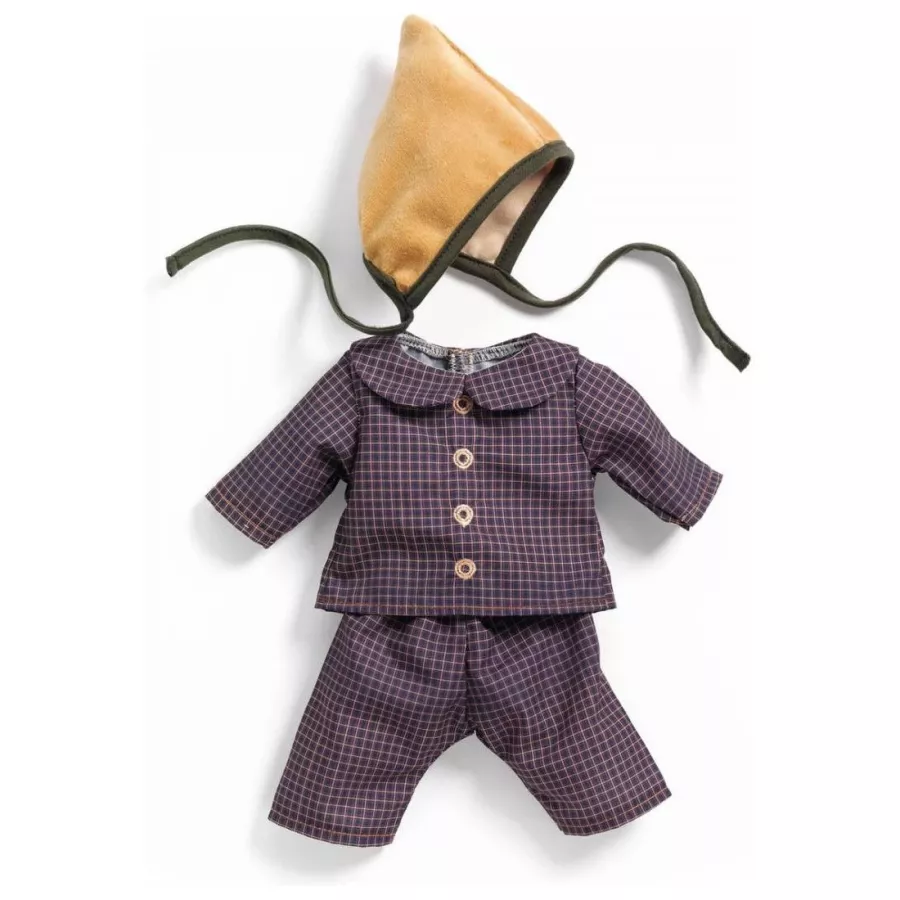 On habille notre jolie poupée Poméa, avec cette tenue tendance composée d'une chemise, d'un pantalon élastiqué et d'un béguin.