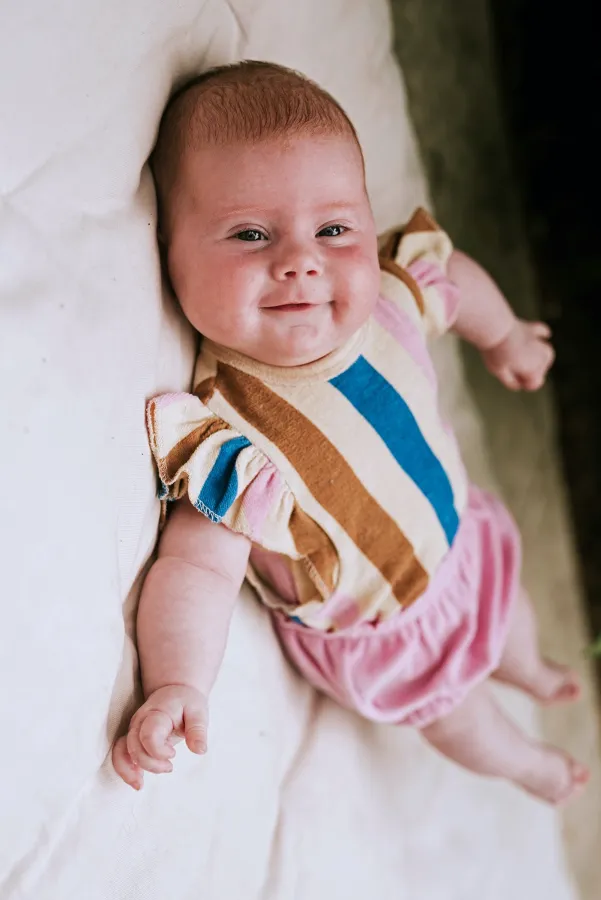 Des volants espiègles et des rayures audacieuses : cette barboteuse est synonyme de liberté de mouvement.