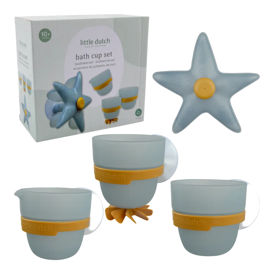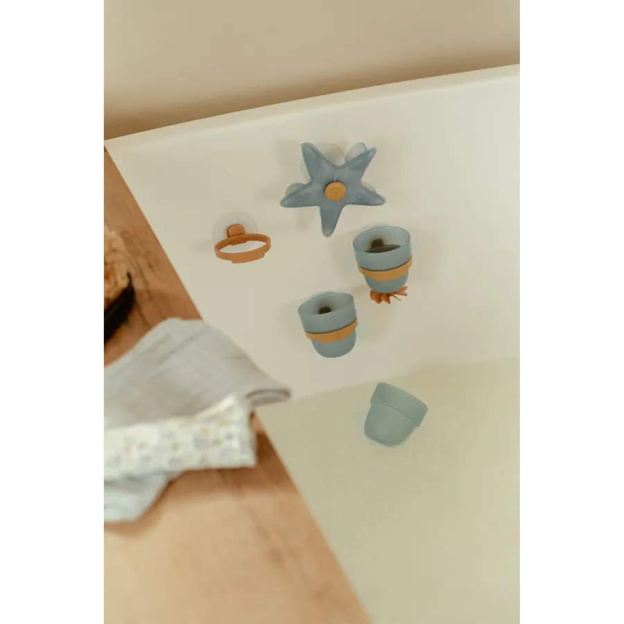 Le bain devient un moment encore plus agréable avec cet ensemble de bain bleu. L'ensemble contient 4 éléments équipés de ventouses : une roue en forme d'étoile de mer, deux tasses de bain et une tasse verseuse. Accrochez les éléments sur la paroi de la baignoire ou le mur de la douche et versez de l'eau avec le gobelet verseur pour faire tourner la roue. L'ensemble est emballé dans une boîte en couleurs. Convient aux enfants de 12 mois et plus.