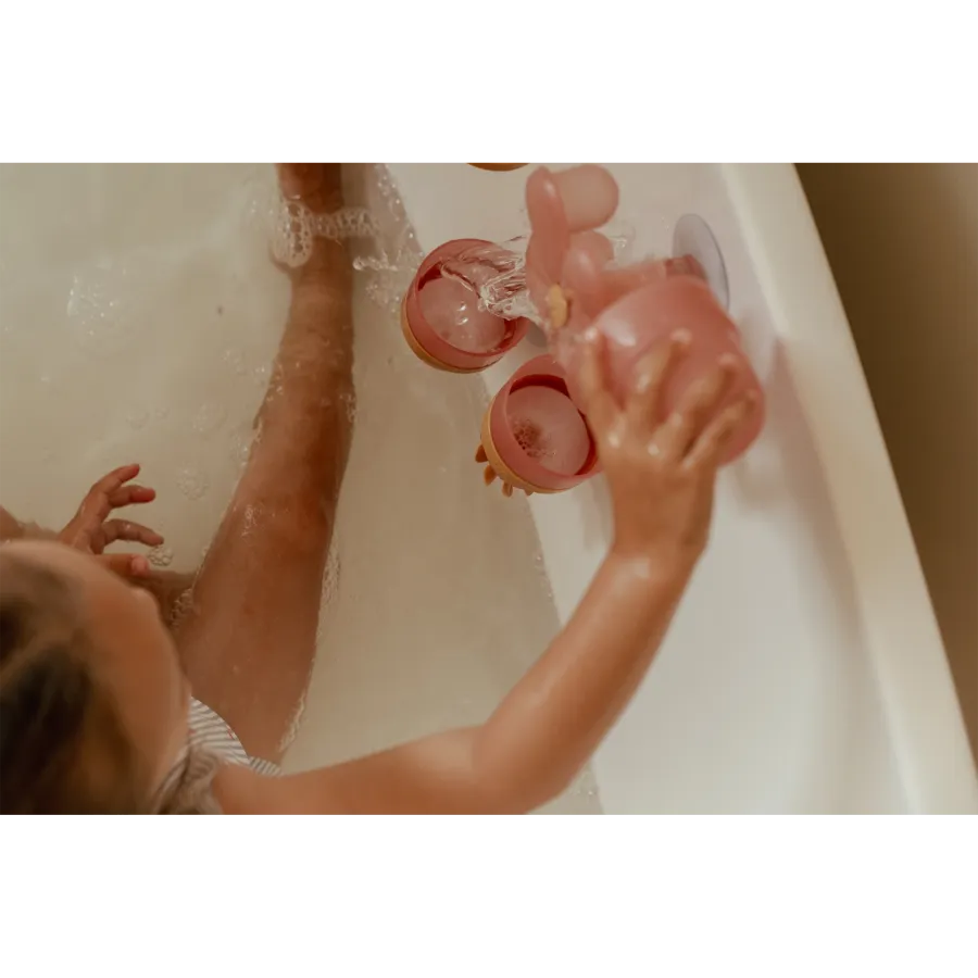 Le bain devient un moment encore plus agréable avec cet ensemble de bain rose. L'ensemble contient 4 éléments équipés de ventouses : une roue en forme de fleur, deux tasses de bain et une tasse verseuse. Accrochez les éléments sur la paroi de la baignoire ou le mur de la douche et versez de l'eau avec le gobelet verseur pour faire tourner la roue. L'ensemble est emballé dans une boîte en couleurs. Convient aux enfants de 12 mois et plus.