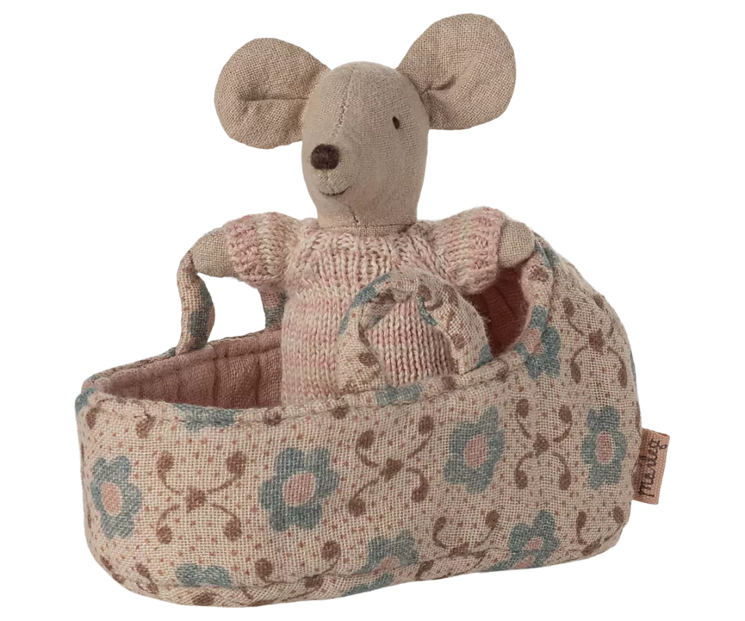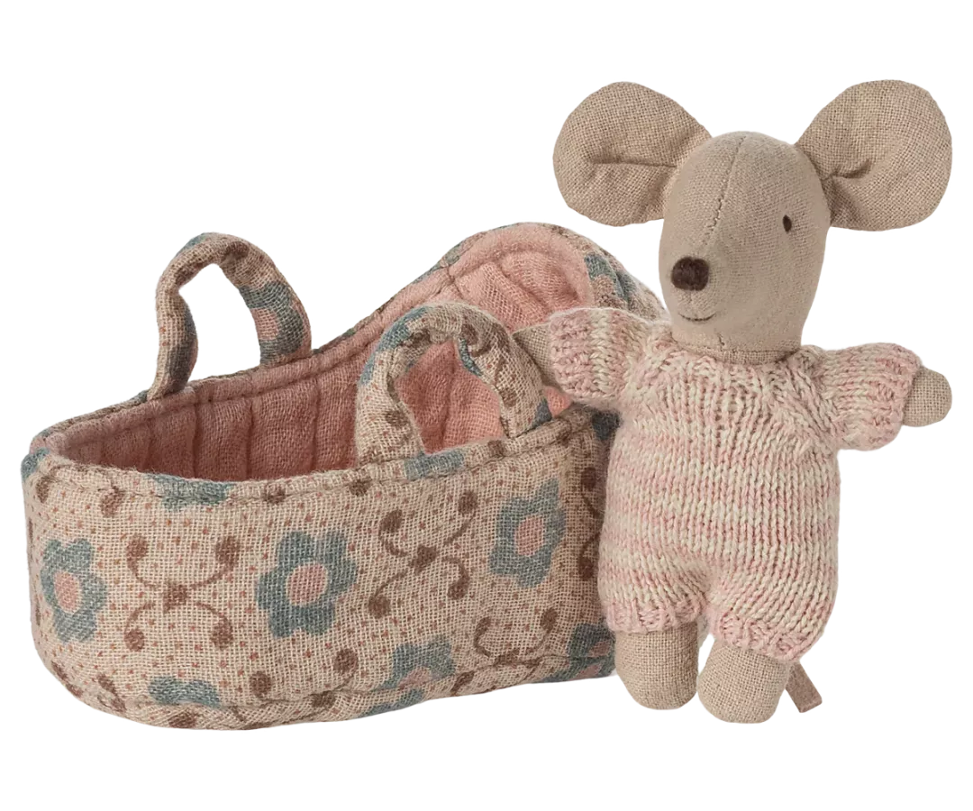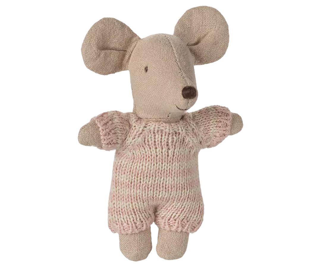 Un adorable bébé souris vêtu d'une combinaison, en tricot, douce et rayée. Bébé souris dort pendant des heures dans son couffin matelassé et peut être transporté dans toutes vos escapades.