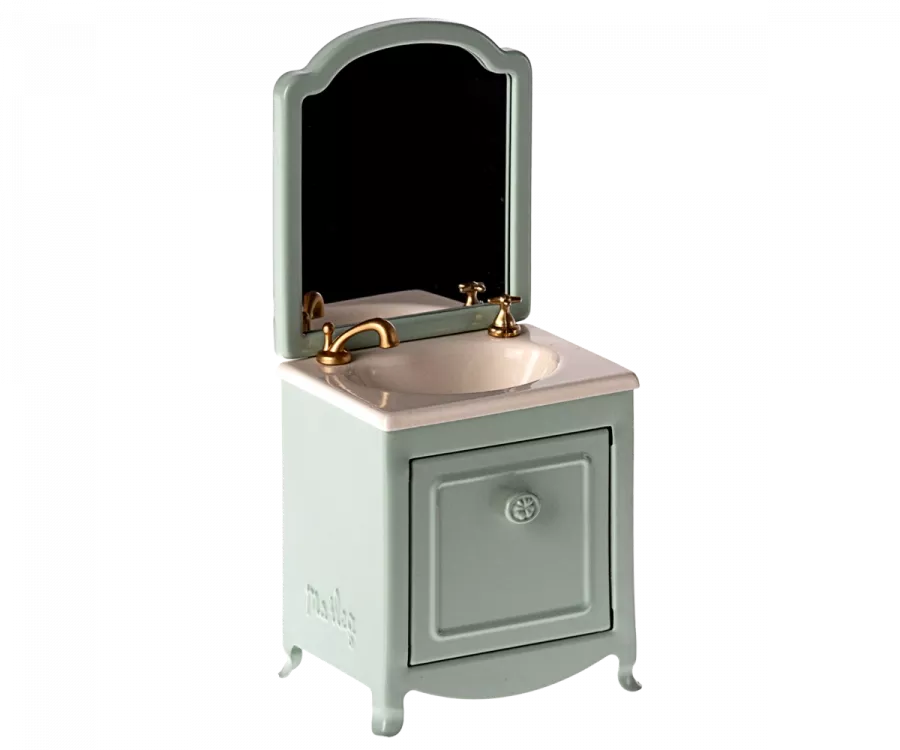 Petite coiffeuse pour la salle de bain, avec un petit évier, un miroir et un placard.