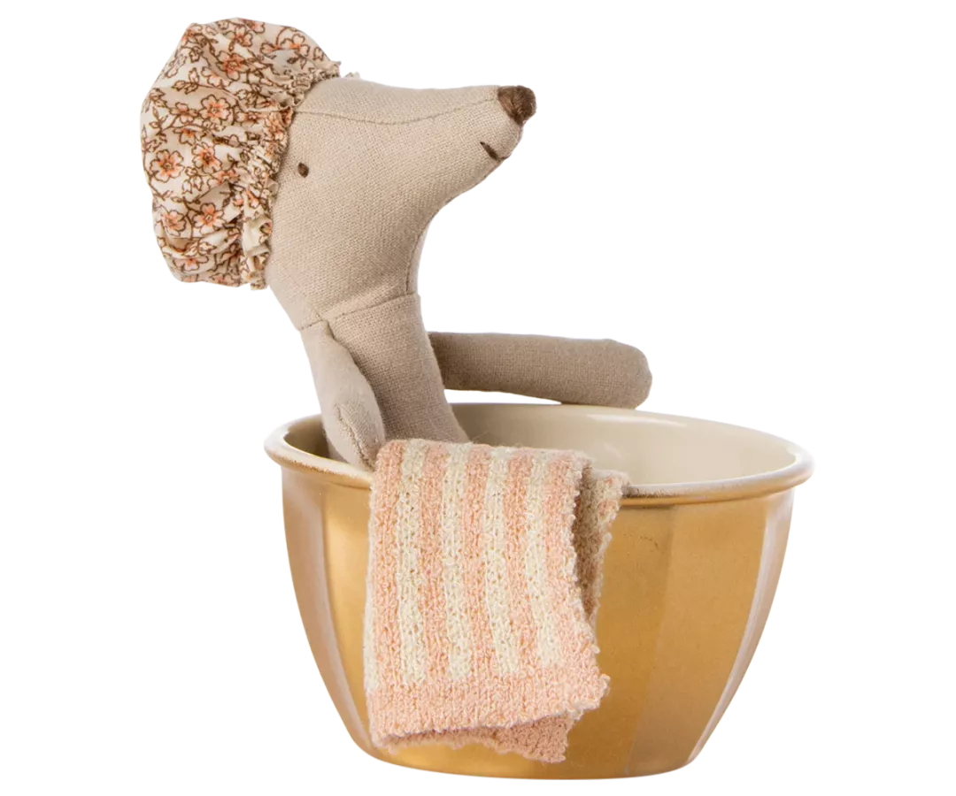 Ce jeu contient une baignoire dorée, une grande sœur souris, un bonnet et une serviette