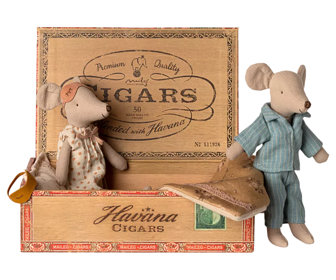 Un classique Maileg. Maman et Papa souris portent leurs beaux vêtements de nuit et leurs masques sur les yeux.