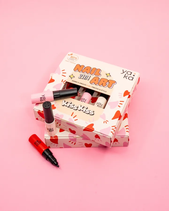 Le coffret de vernis à ongles 2-en-1 Kiss Kiss est le kit parfait pour un nail art qui va faire battre les cœurs ! Un rouge éclatant, un rose pâle tendre et un blanc naturel : notre trio permet de créer des manucures adorables facilement à la maison 💘