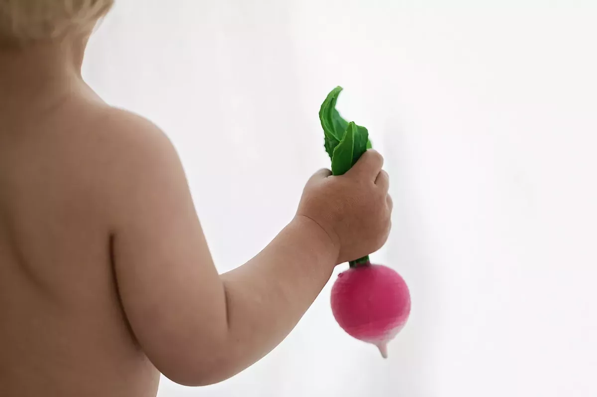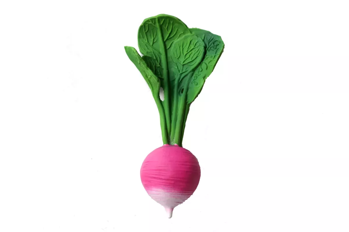 Ramona le radis : facile à attraper par ses feuilles, ses ramifications stimulent les sens de bébé lorsqu’il le mâchouille.